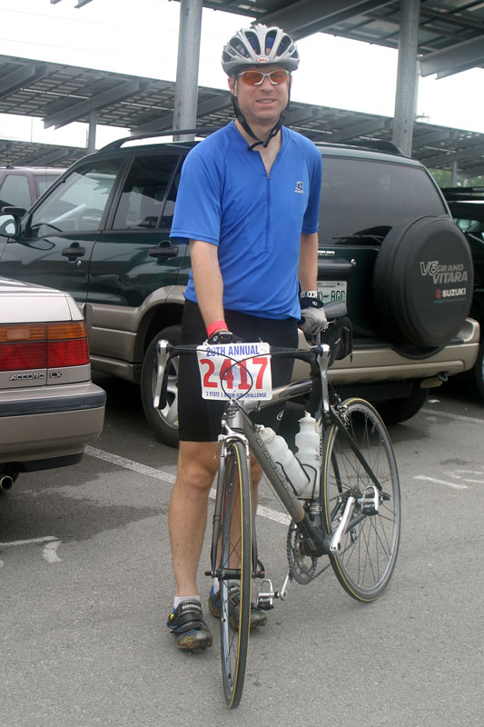 Upon arrival, I picked up my registration packet, changed, and prepared to ride. The convoy of 2,400 cyclists had already started rolling by the time I was ready. I eased my way into the herd and began rolling. But a couple blocks later, I realized I had forgotten to affix the registration number to my bike. So I peeled off to the side went back to the car to get it.